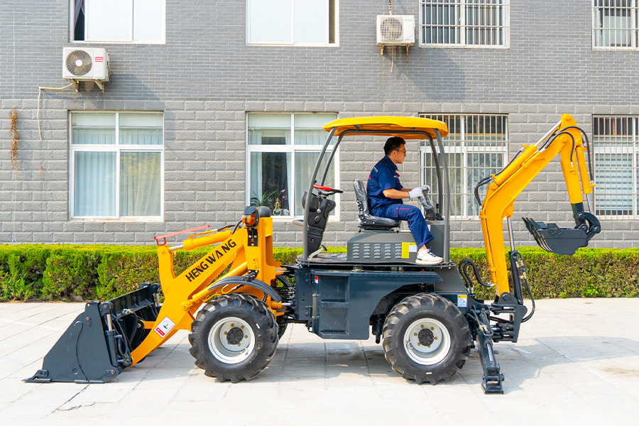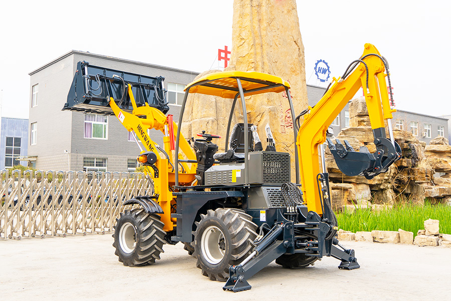 HW10-50 backhoe machine series small excavator features a unique design where the original loading function remains unaffected while scraping. The excavation part is folded as the counterweight, while the loading part serves as the chassis support during excavation.